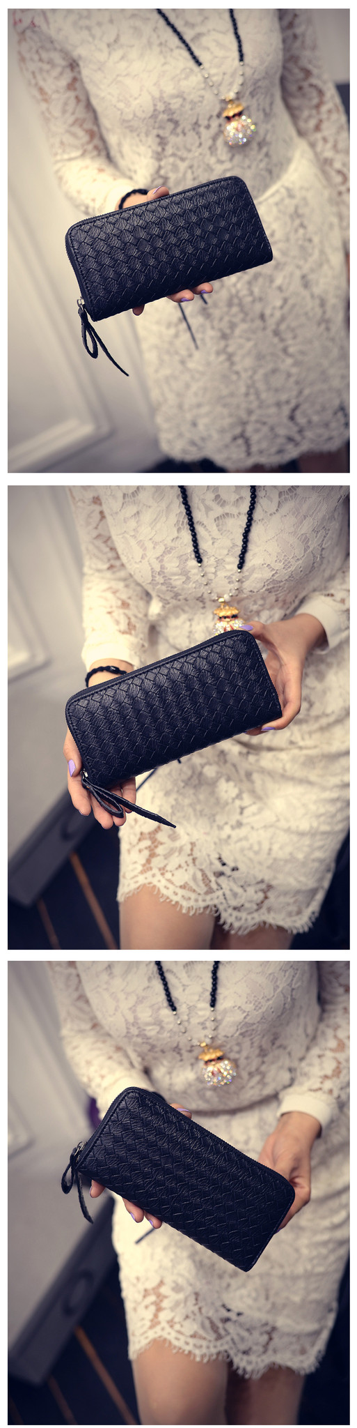 Класичний жіночий гаманець подвійного складу. Вона закривається на металеву блискавицю чорного кольору. Усередині є три відділення для купюр, 8 відділів для банківських карт і одне відділення для монет на блискавки. Дизайн гаманця зроблений у вигляді оригінального фактурного плетення.