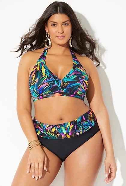 ьник жіночий роздільний, з високою талією з рослинним візерункомЗручний жіночий роздільний купальник. Бюст із яскравим різнобарвним рослинним принтом, застібається на спині на подвійну застібку, на шиї зав'язується. Є знімні поролонові чашечки. Плавки-сліпи з високою посадкою, зверху мають додатковий закот із рослинним візерунком. Купальник добре підходить на повну фігуру та великі груди.